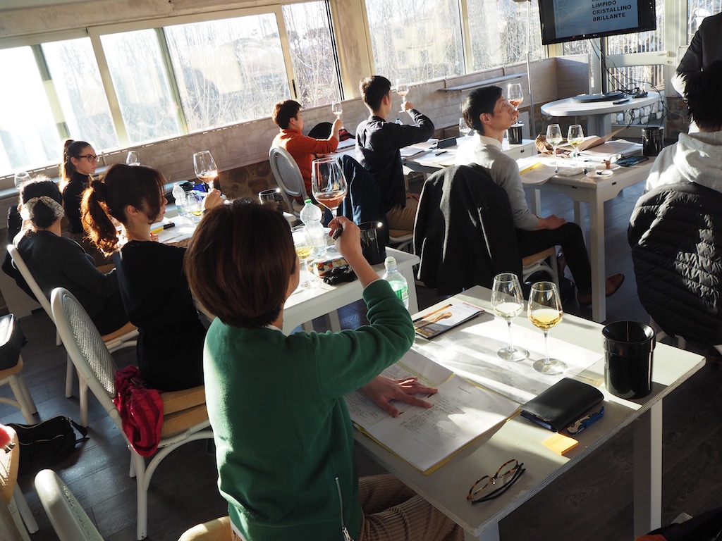 ソムリエコースは、醸造などワインの基礎から、テイスティング手法、イタリアや世界の各地の葡萄品種やテロワール、そしてワインと料理のペアリングを体系的に学べるように網羅されています。座学だけではなく、実際にテイスティングや試食を通じて体を使ってワインを理解する、まさにイタリアならではの経験です。